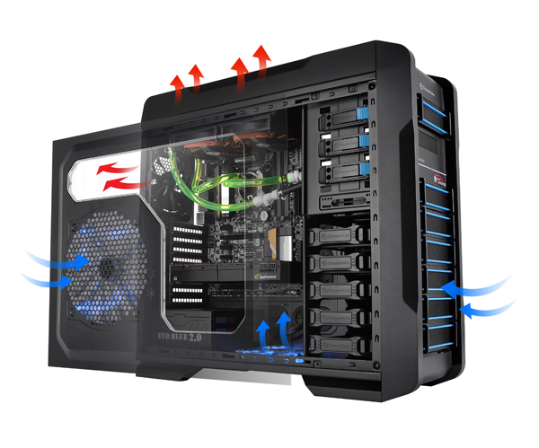 Preinstalled with one 120mm rear fan; one large 200mm front fan; two large 200mm Blue LED fans mounted on the top and side to optimize the system cooling performance for extreme airflow. In order to keep the interior dust free, all intake ventilation holes come with dust protection, including a removable dust filter on the bottom of the chassis.